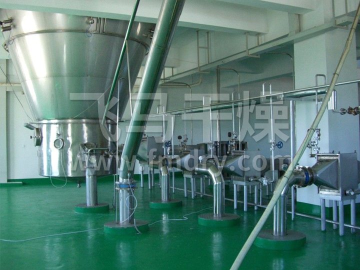 該生產線由供料係統、介質循(xún)環係統、空氣加(jiā)熱(rè)淨化係統、幹燥塔係統、收料係統、控製係統等多個(gè)係統整合而成。主塔係統集中了目前噴霧幹燥工程的技術,噴幹機組的收料(liào)係統由一級旋風分離器+布袋除塵器組合形成。一級旋風采用高氣量高效率(lǜ)旋風(fēng)進行收(shōu)集,其收粉率能達到96%左右,而布袋除塵器是針對蛋(dàn)白粉類除塵專門設計的優(yōu)化設備,能使物料與風進(jìn)行完全分(fèn)離並沉降,布袋為拒水防(fáng)油防靜電布(bù)袋,過濾目(mù)數可達500目以上。